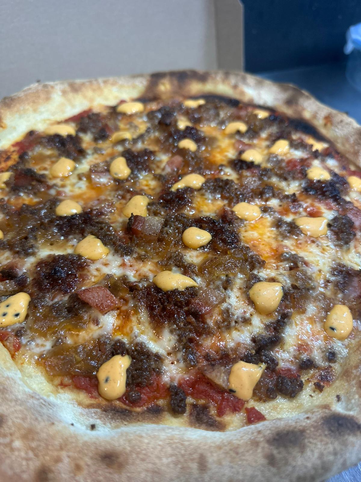 Tomaquet, Mozzarella, carn picada, ceba caramel.litzada, guanciale, melmelada de baco i gotas de salsa emmy