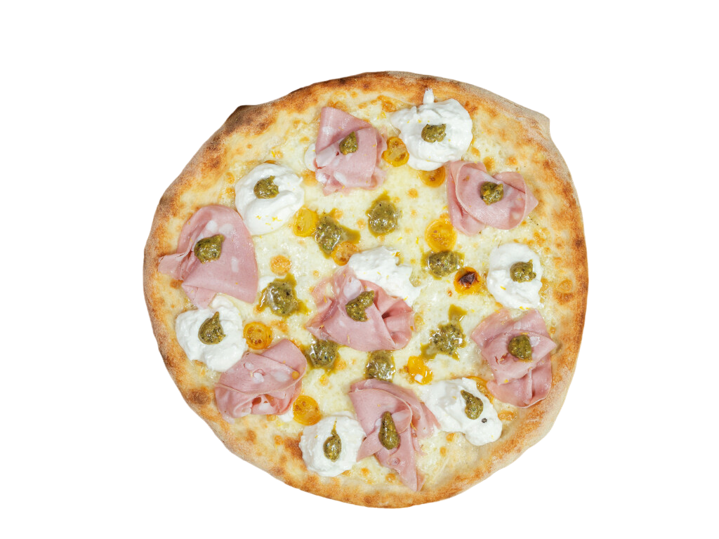 Mozzarella, cherry groc, burrata, mortadel·la de festuc, pesto de festucs i ratlladura de llimona