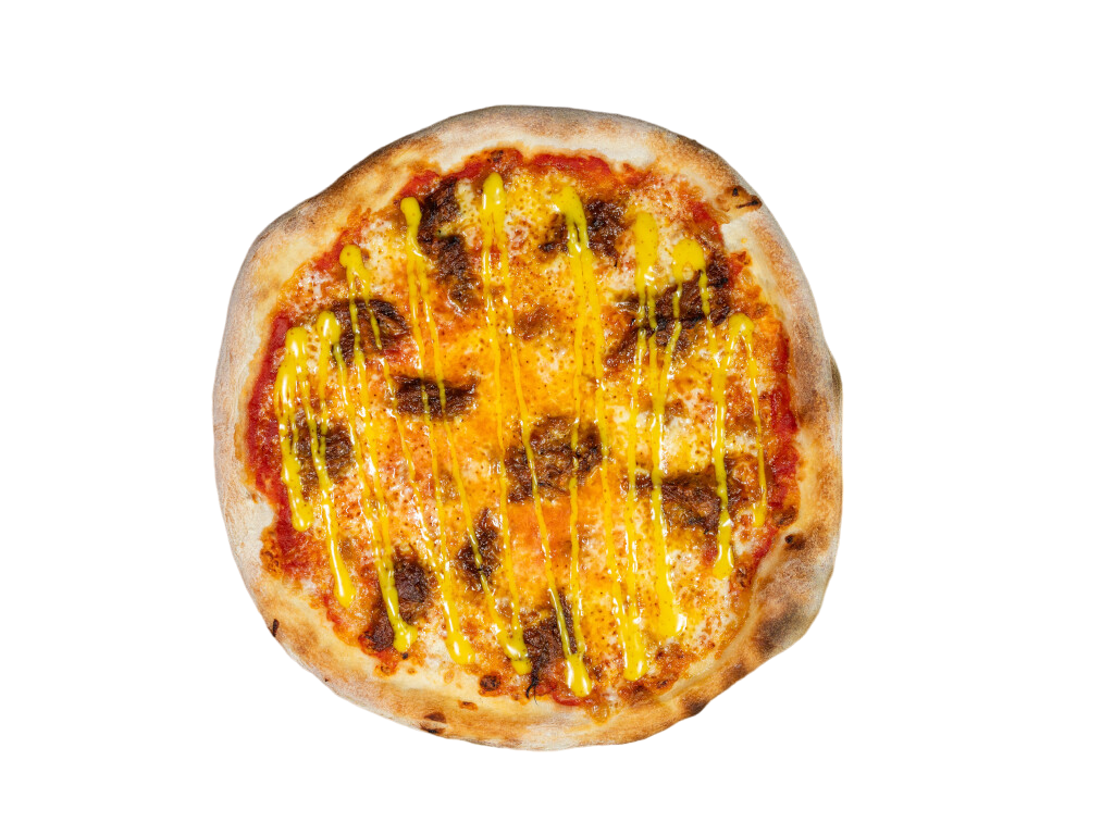Tomàquet, mozzarella, pulled pork, ceba caramel·litzada, cheddar i salsa mel i mostassa