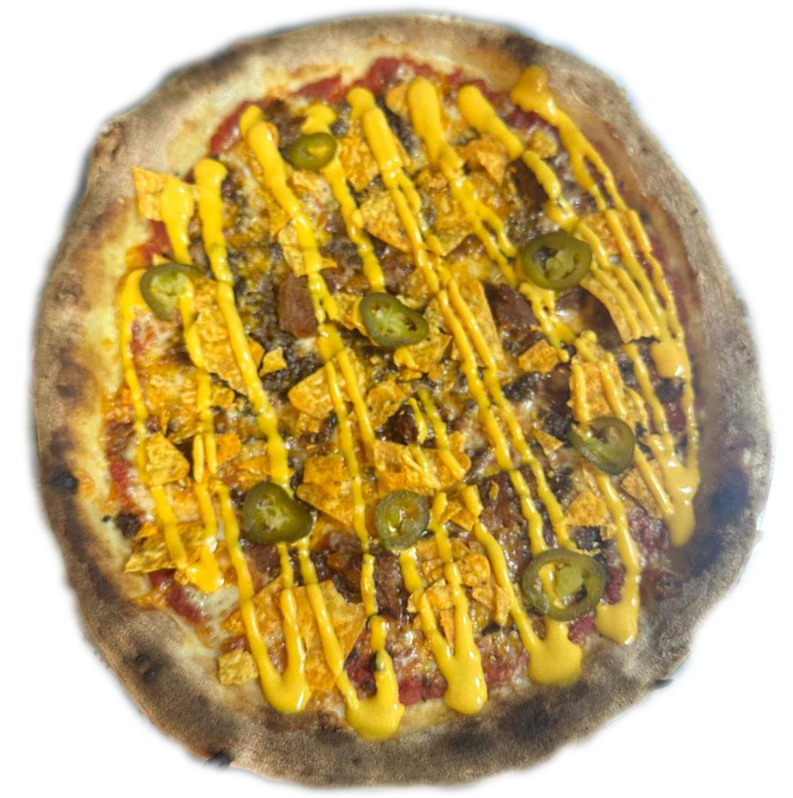 Tomaquet, mozzarella fior di latte, carn picada, pulled pork, cheddar, doritos, jalapeños i salsa cheddar
